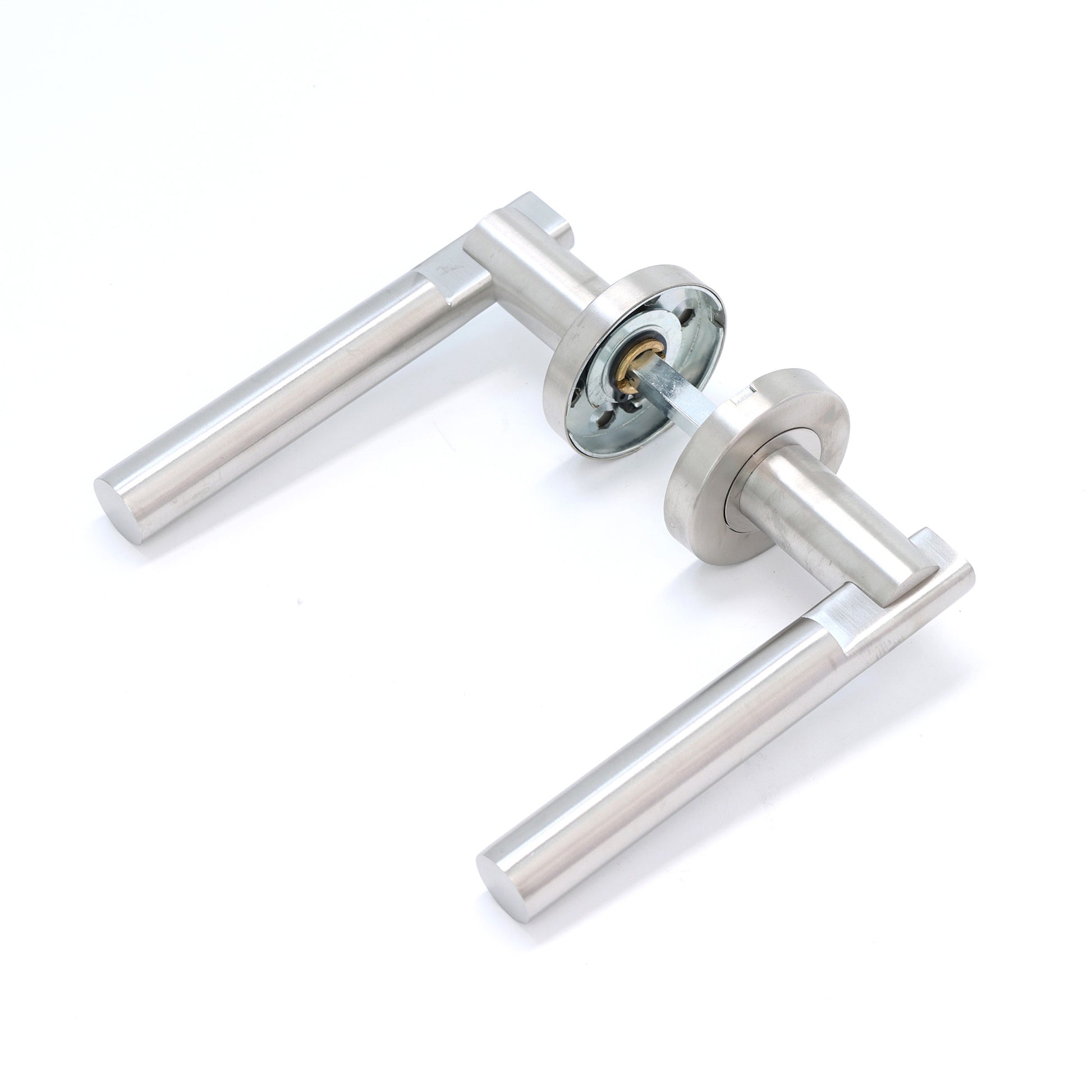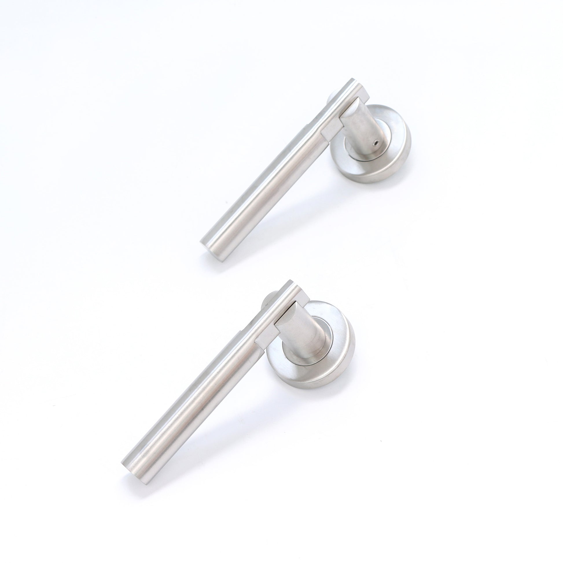 - Satin Stainless Steel Lever Handles on Round Rose: These handles provide a clean, modern look that complements any door, adding a refined touch to your space.