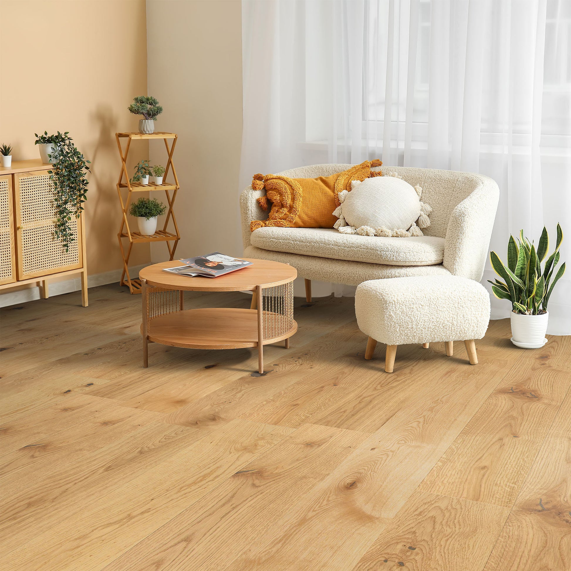 The light brushing technique enhances the wood's grain, adding depth and character while maintaining a smooth feel underfoot. Ideal for both contemporary and traditional interiors, this flooring pairs beautifully with various decor styles. Invest in Leader-Tec's Natural Oak flooring to elevate your home with the beauty of real wood and enjoy a sophisticated, enduring finish that stands the test of time.