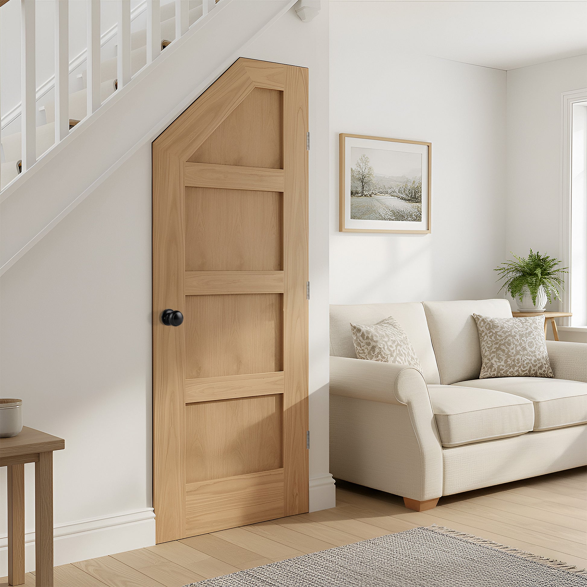 The Liberty Doors Oak Internal Unfinished Shaker 4 Panel Angled Under-Stair Made-to-Measure Cupboard Door is perfect for adding a touch of elegance to any interior space. Crafted from high-quality oak, this unfinished door offers a classic Shaker style that complements both traditional and contemporary decor. Its made-to-measure design ensures a perfect fit for under-stair areas, maximising storage while enhancing the overall aesthetic of your home.