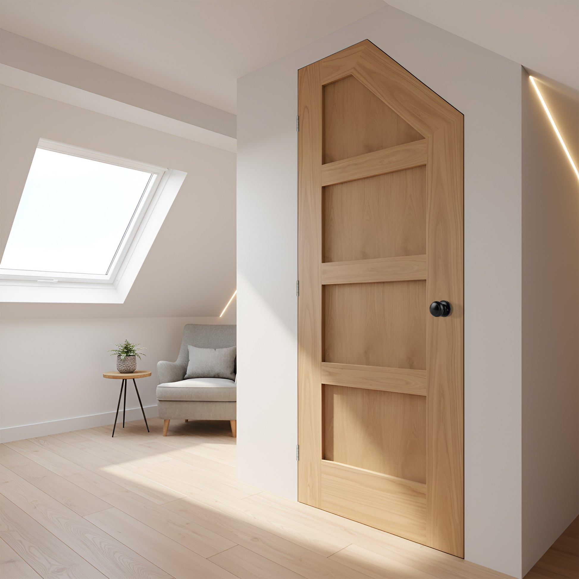 The Liberty Doors Oak Internal Unfinished Shaker 4 Panel Angled Under-Stair Made-to-Measure Cupboard FD30 Fire Door combines timeless style with essential safety. Crafted from premium oak, this Shaker-style door suits any interior while offering a bespoke fit for under-stair spaces. The unfinished design allows for personalisation to match your decor seamlessly, providing both aesthetic appeal and practical functionality.
